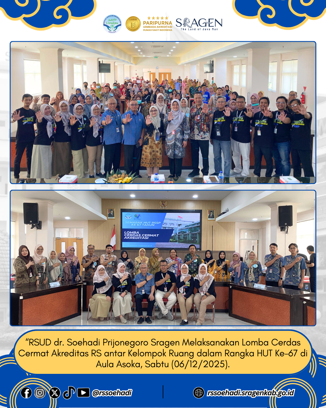 - RSUD dr. Soehadi Prijonegoro Sragen Melaksanakan Lomba Cerdas Cermat Akreditas RS antar Kelompok Ruang dalam Rangka HUT Ke-67 di Aula Asoka, Sabtu (06/12/2025). 06-12-2025