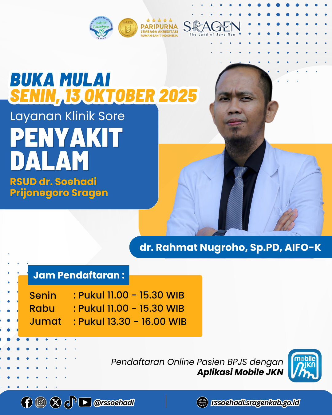 RSUD dr. Soehadi Prijonegoro Sragen membuka Layanan Klinik Sore Penyakit Dalam dg dr. Rahmat Nugroho, Sp.PD, AIFO-K.