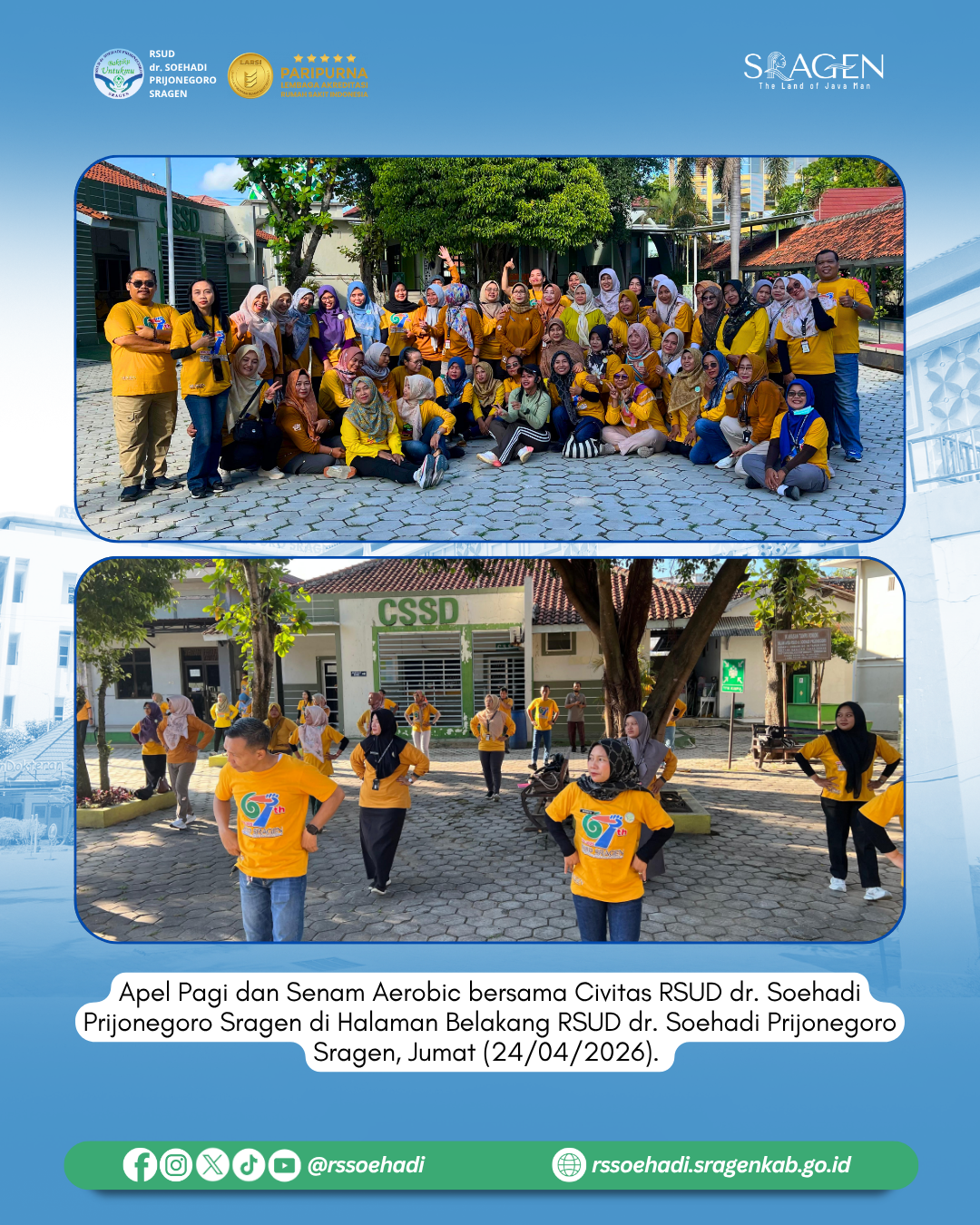 RSUD dr. Soehadi Prijonegoro Sragen menggelar kegiatan apel pagi yang dilanjutkan dengan senam aerobik di halaman belakang rumah sakit, Jumat (24/04/2026). Kegiatan ini diikuti oleh karyawan dan karyawati sebagai upaya menjaga kebersamaan serta meningkatkan semangat kerja.