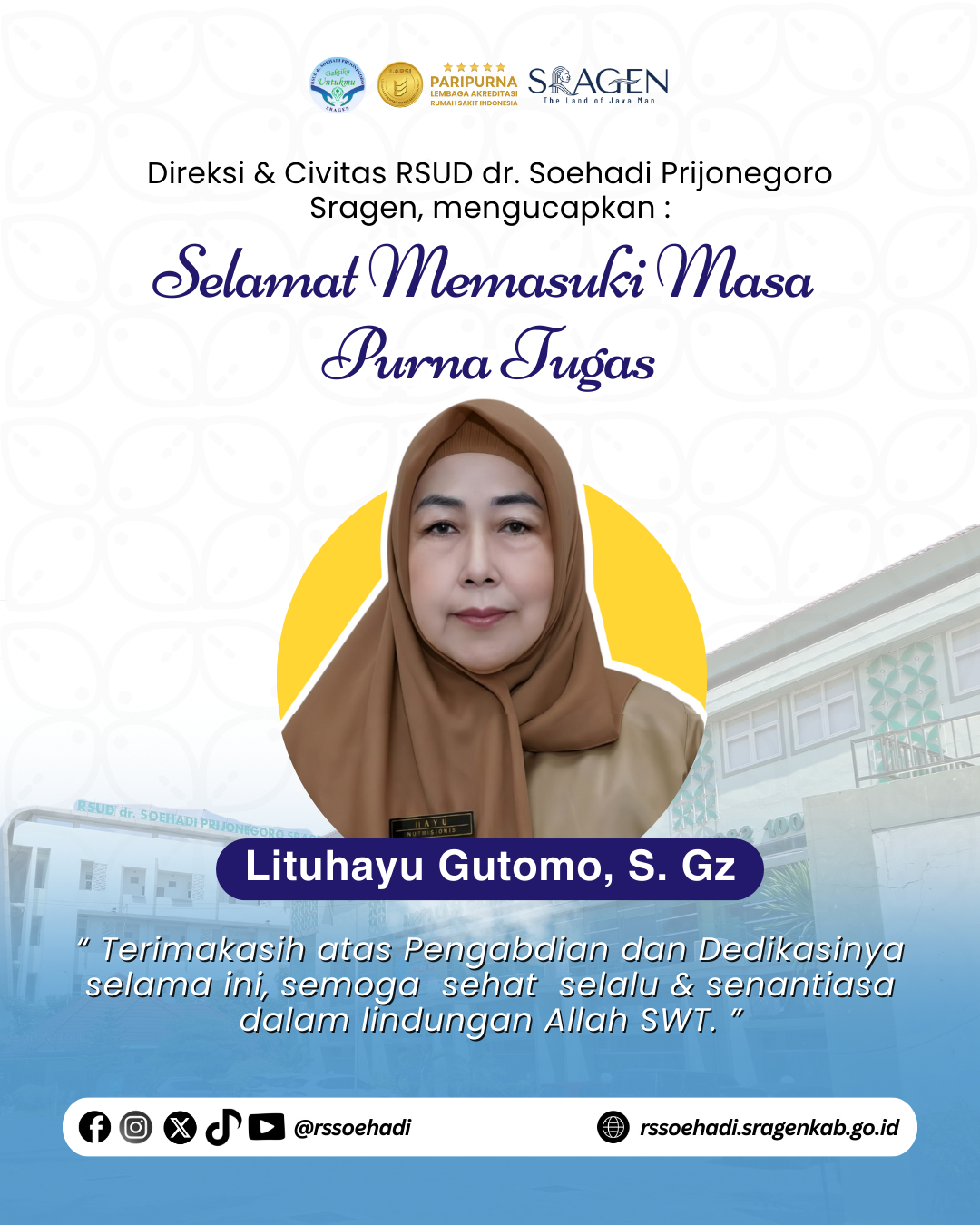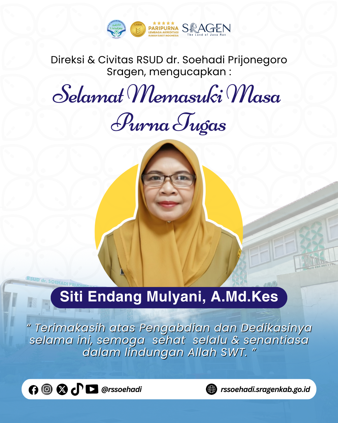 - Direksi & Segenap Civitas RSUD dr. Soehadi Prijonegoro Sragen mengucapkan Selamat Purna Tugas, kepada Ibu Puji Hastuti, S.Kep.Ners. 01-September-2025